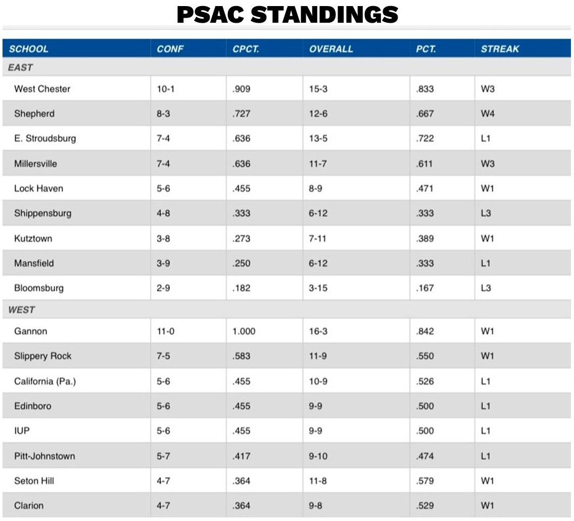 Slippery Rock entered the game with three straight setbacks in conference play, including a 31-point loss at California and a 26-point loss at Gannon. The Rock lost to Clarion by 10 points on Saturday.